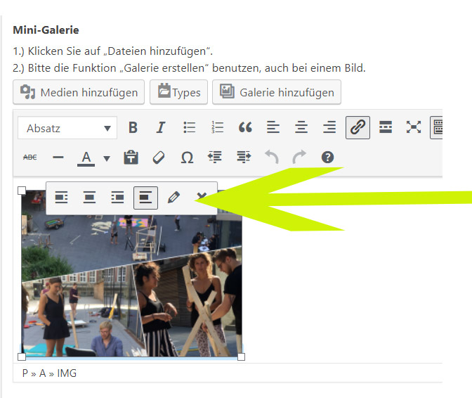 Die Lösung besteht darin, dass man das bild nochmal anpackt und nur die Größenausspielung ändert. Man nimmt also den Beitrag, klickt auf „Bearbeiten“ und dann in dem Beitrag selbst nochmal auf das Bild klicken.