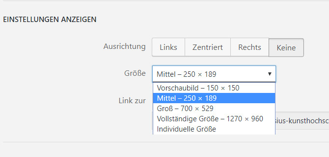 So kann man sich die Einstellungen anzeigen lassen und erkennt, dass das Bild auf eine mittlere Größe von 250×189 Pixeln angezeigt wird, obwohl es in Wahrheit größer ist.