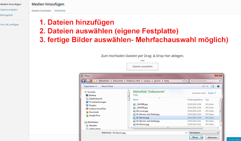 Um eine Minigalerie zu erstellen, klickt man auf „Dateien hinzufügen“ unterhalb von Mini-Galerie. Es öffnet sich der Medienmanager, der die Optionen „Dateien hochladen“ – von der eigenen Festplatte- oder „Mediathek“ anbietet.