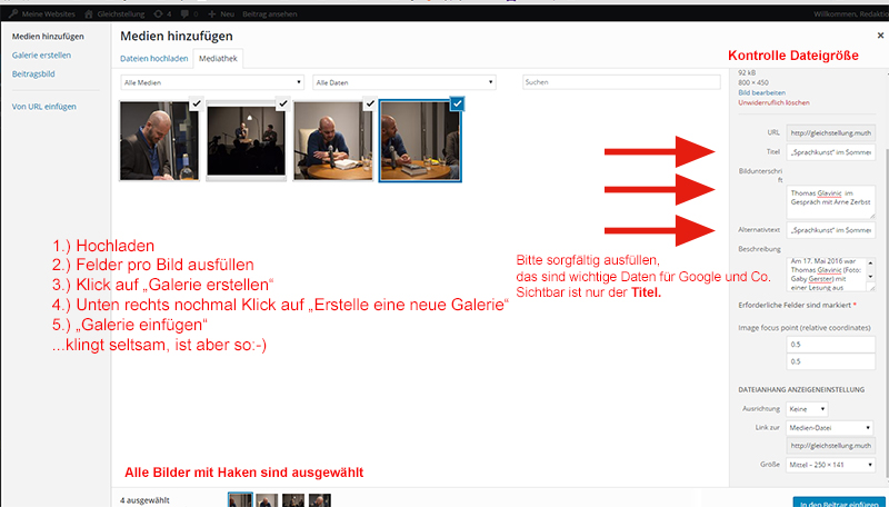 Man kann mehrere Bilder gleichzeitig hochladen und dann noch einzeln textlich beschreiben. Der TITEL ist das, was später oberhalb des Bildes angezeigt wird. Trägt man da nichts ein, wird der Dateiname angezeigt…das sieht nicht gut aus und sollte unbedingt vermieden werden.