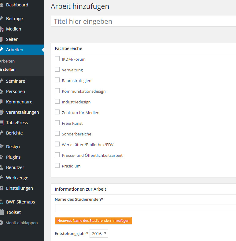 Neben den unmittelbaren Urheberschaftsangaben kann man hier auch wieder eine Galerie einbinden. Hier heißt das Feld dafür „Bilder der Arbeit“. Zusätzlich besteht die Option, ein Video einzubinden, das man zuvor bei Vimeo oder youTube eingebunden hat. Dieses Video kann man sogar oberhalb der Galerie und/ oder anstelle eines Beitragbildes anzeigen lassen.
